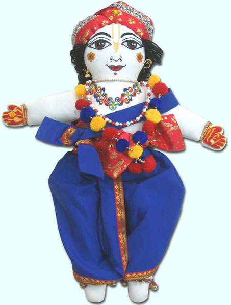 His body color is a glowing ivory shade with embroidered face, hands, feet, and necklace. Beautifully decorated with pure Tulasi neck-beads, colorful bead necklace, soft woolen ball 'flower' garland, and ankle bells. Dressed in blue garden-silk dhoti and shawl with satin-silk turban and belt.